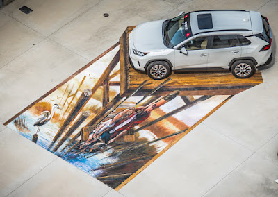 The attraction of color somehow give happiness to people. We see it, we love it when the color is use in fashion, art include in our daily life. The floor mural shows a father and daughter spending time together by fishing on the lake at dusk. The painter provided the use of real object which is the car to make it more real illustration of art. This type of art play with the illusion of our eyes on views the art from side. The pictures show the view from the above and side, gives us the different view. The overall message are joy, care, responsibility, unity, and use of time.